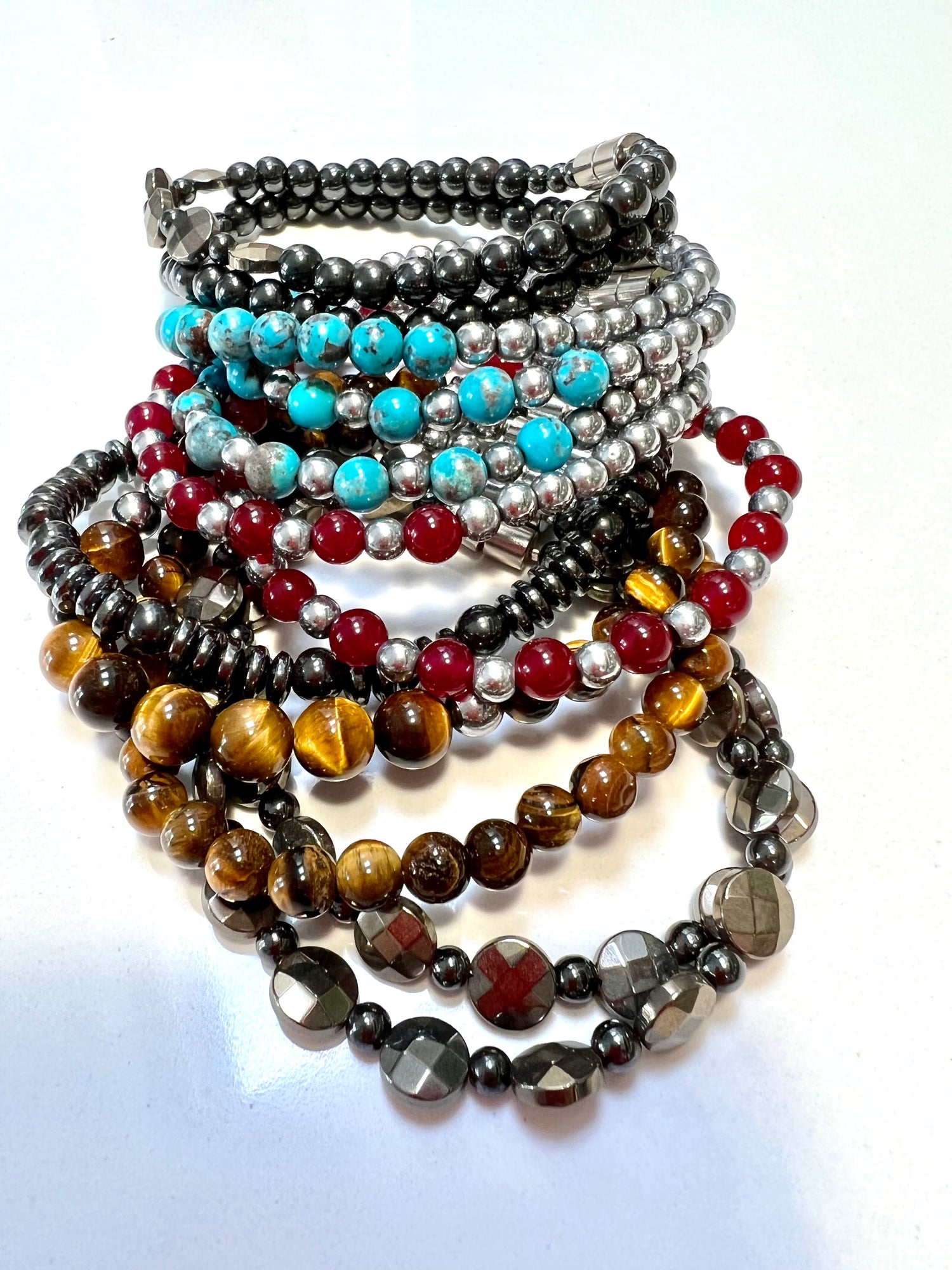 A lovely selection of bracelets using semi precious stones with a magnetic clasp. Please note that as these are natural stones size and colour may vary. They can be altered to fit on request.